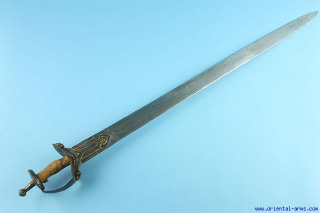 Up for sale is this very good Khanda sword, late 18 C., with a 35 inches dual edge blade marked with the Eye Lashes quality mark on both sides of the blade. The basket shape handle is classical Indian with gold koftgari decoration ending with a short pommel spike. Total length 41inches. Very good condition. Old age crack on the handle D guard. Losses to the gold koftgari decoration. No scabbard. A rare sword. |