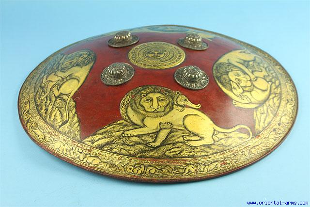 This very fine hide shield is coming from Udaipur in Rajasthan, India. Late 19 – early 20C. Large size 22 inches diameter, made from rhino hide, finely painted red on both sides and decorated with very fine gold colored hunting scenes. Four very finely chased silver bosses. Inner hand cushion and handles (later). Very good condition. Very minor losses to the gold painting. Very small distortion on the perimeter. A very impressive shield |