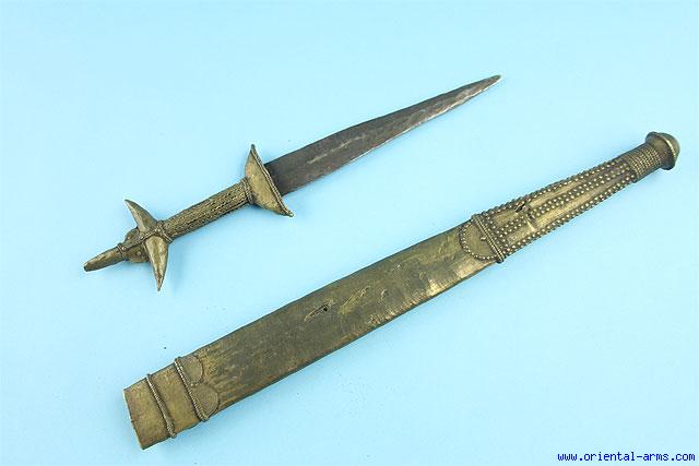 This ceremonial dagger is made by the people residing in Nigeria - Cameroon borders. The Vere people are masters in brass casting and uses it to produce hilts and daggers scabbards imitating the wood and leather work of similar items. Here we offer such a ceremonial dagger, with an 8 inches blade (crudely forged), with a cast brass handle and scabbard (Considerably longer than the blade). Total length 23 ½ inches. Good condition. |