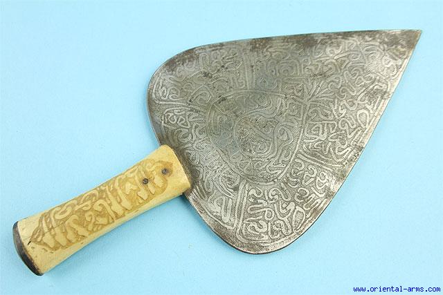 This spear shaped steel blade is coming from Sudan, late 19 C. It is most probably a ceremonial spear or a battle standard. 7 ½ inches long 5 ½ inches wide blade, entirely covered with etched imitation of inscription in Arabic letters. Bone grip carved with Arabic inscription on one side and floral design on the other side. Black horn pommel cover. Total length 13 inches. Very good condition. |