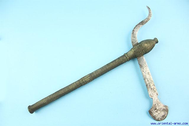 This fine axe has a long 8 inches blade 2 inches edge. The blade up swept tail is 6 inches long. It is mounted into a wood haft entirely covered in densely braided brass wires in a very intricate pattern, Total length 18 inches. Very good condition. The braided brass wires is very common on Zulu artifacts but the blade shape may indicate somewhat an origin more to the North. Fine work. Early 20C. |