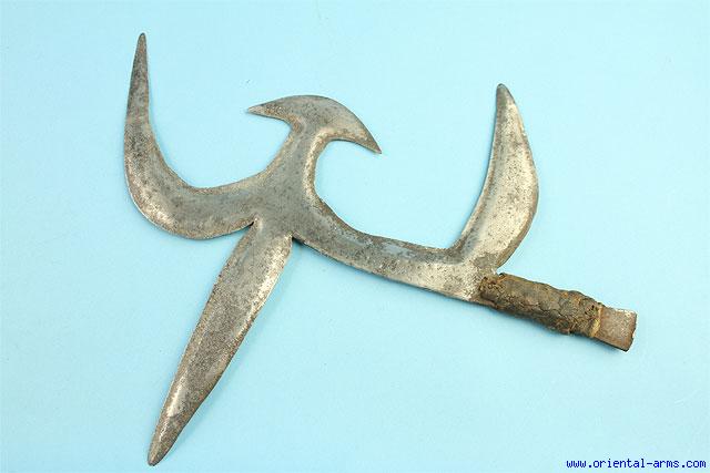 This throwing knife is a classical early type usually associated with the group of tribes belonging to the Ngbaka people residing in Zaire. It is characterize by the styled cross shape composed of three blades and a side crown. Approximately 17 X 13 inches. Handle bound with leather. Good condition. |
