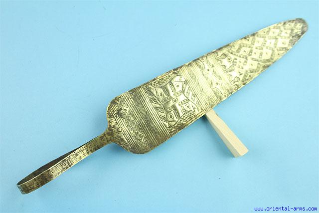 The Yoruba people from Nigeria uses this type of cult knife and carry it in front of dignitaries in public ceremonies. Whole brass spear head shape with a loop handle. Finely engraved in geometrical design on one side of the blade. Length 18 inches. Very good condition. |