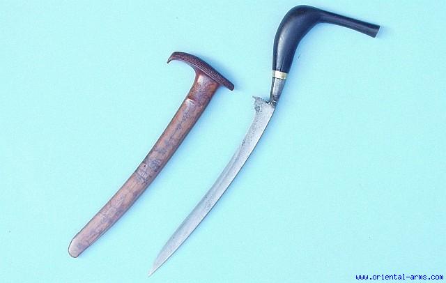 A very nice RENTONG knife / dagger from, sometime known as “BADE-BADE”. The version offered here is mostly used by the Acehnese people from North West Sumatra (see Stone Glossary, fig. 106 number 4 page 85). The blade is 9 inches long down curving and single edged. The hilt is horn sharply up-curving and with a gold (?) collar disc. The scabbard is wood engraved with very delicate design. Very good condition A very nice piece from the second half of the 19th C attractive and decorative item. It is offered here at a very low price. |