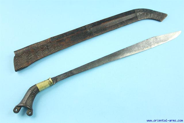 This very good sword is coming from Sumatra. Late 19C. 16 inches single edge blade with a clipped spine. Well made carved wood handle with a forked pommel and large brass. Finely carved wood scabbard. Total length 23 inches. Very good condition. Age crack and minor wood chips on the scabbard. |