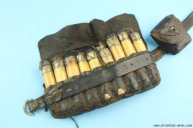 This old ammunition pouch is Afghan, late 19C. It is composed of 8 cylindrical bamboo containers with fabric plugs, all contained in a leather pouch with a leather belt. Very unusual set. Very good condition. Some losses o the leather pouch.
