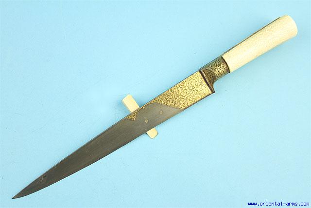 Here is an Indian Kard dagger with fine wootz (Damascus) single edge blade 9 1/2 inches long, decorated with very fine and delicate gold inlaid decoration. the blade has also two round gold inserts. The handle has two slabs of ivory with an unusual very tiny dots decoration. The bolsters and grip straps are inlaid with fine gold as well. Total length 14 inches. a small forgoing flaw on one side of the blade. 18-19C. This dagger is much better than most examples we have handled. |