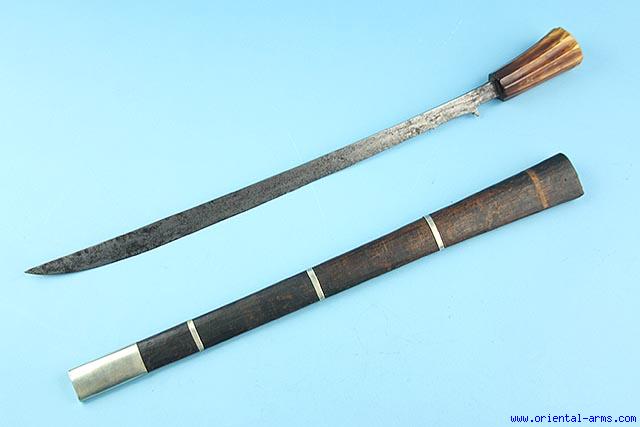One of the rarest form of swords from Sumatra is this sword of the Toba Batak people, also known as Piso Gading. The single edge slender but thick blade is 21 inches long. The fluted handle is cut from a massive piece of elephant ivory. Wood scabbard bound with silver bands (One missing) and silver chape. Very good condition. Very good age patina of good deep color on the ivory handle. Nicely patinated blade. For a similar swords see also: Albert G. Van Zonneveld Traditional Weapons of the Indonesian Archipelago Fig 421 P. 107, and Achim Sibeth The Batak- Peoples of the Island of Sumatra Fig 212 P. 163. A rare sword. |