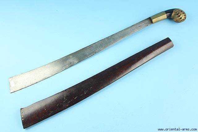 This Klewang sword is a rare form of swords used by the Batak people from Sumatra. It has a up-curving 22 1/2 inches blade, widest at the tip. Wood handle with beautifully carved pommel painted with gold colors and mounted withheavy hexagonal brass collar. The scabbard is wood, open at its top to allow withdrawal of the blade. Total length 28 inches. Very good condition. Minor wood chips at the scabbard tip. For a very similar sword seeA. G. Van Zonneveld Traditional Weapons of the Indonesian Archipelago>/I> Page 70, Fig 268. |