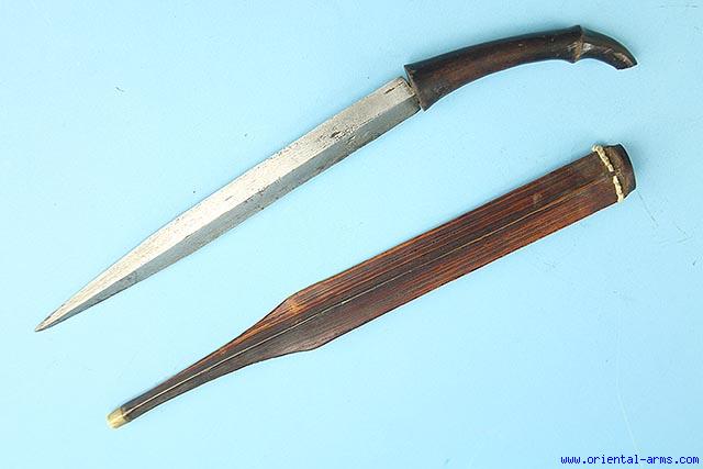A very rare example of a dagger from the island of Mentawai, eastern Sumatra also known as Palitai. 10 inches blade of diamond cross section. wood handle sharply curved (slightly shortened). Wood scabbard. Total length 18 inches. Very good condition. |