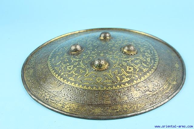 This very fine shield is Persian, Qajar period, second half of the 19 C. The outer band has chiseled Persian figures with Arabic letters inscription. Inner part of the shield is beautifully inlaid with gold koftgari decoration. Four chiseled bosses. The shield 18 Inches diameter.Very good condition. Small losses to the gold work. A fine item. |