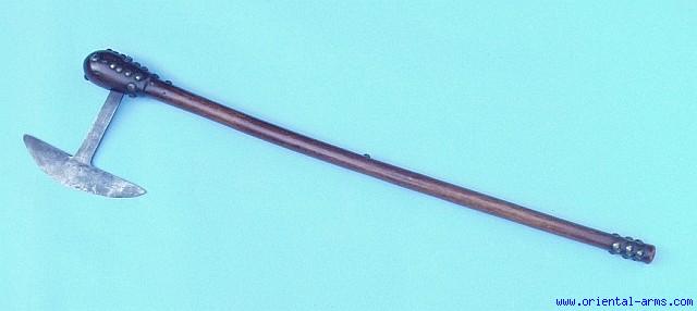 An authentic, 19 C. axe of the Shona and Tswana tribes from Zimbabwe and Botswana. A 7 inches crescent shape blade mounted on 30 inches hardwood haft and decorated with brass tacks. The blade is decorated with light engraving. Excellent condition.