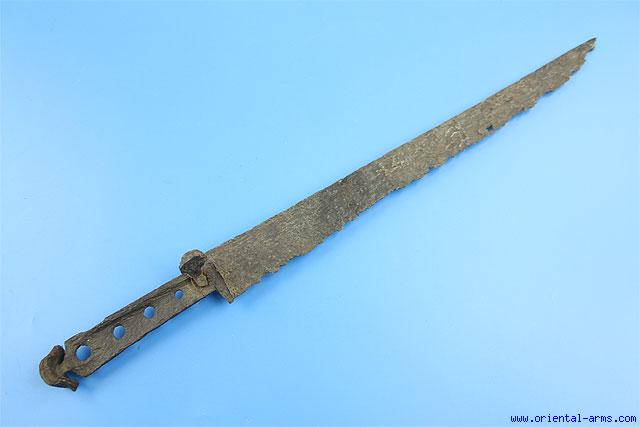 This long knife is German, late 15 - early 16C. also known as Bauernwehr . It was used as hunting knife or for defense by peasants and/or other non warriors. Blade 16 total 21 inches. Excavated condition (Stabilized).