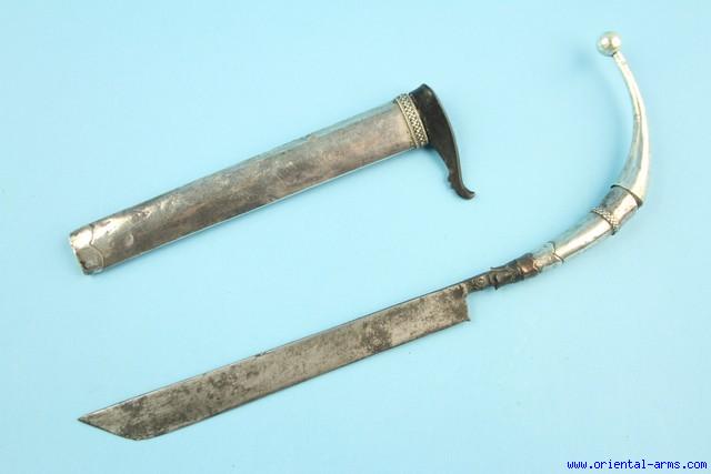 Here is a very rare and early type dagger from Sumatra, used by the Aceh People. It has a 9 inches single edge straight blade ,Silver bound up curving handle and silver scabbard with black horn mouth. Total length 13 1/2 inches. Very good condition. |