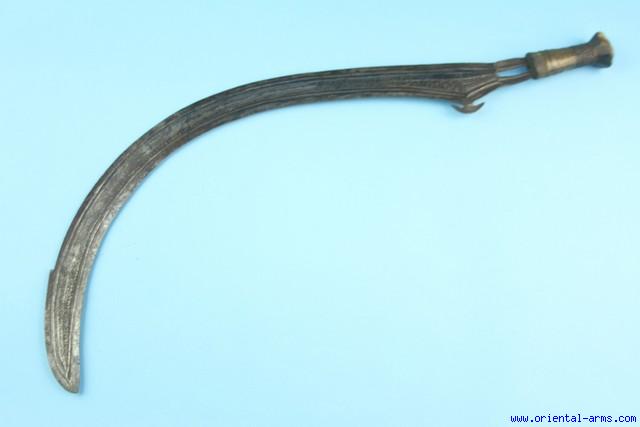 Up for sale this very good, long sickle shaped sword of the Azande from central Zaire (also used by the neighboring tribes, Boa and others). Early to mid 20 C. 25 ½ inches blade, flat diamond cross section on one face and nicely engraved with geometrical design on the other face. Wood handle bound with brass and iron strips. Total length 29 inches. Very good condition. Small wood chips on the handle. |