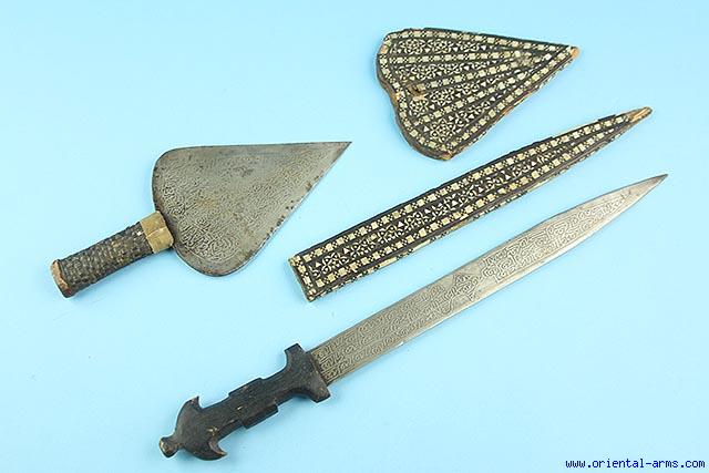 This lot of a spear and a dagger are coming from Sudan, early - mid 20 C. Ceremonial in nature but of good quality and workmanship. The dagger blade is 16 inches long. The spear blade is 8 inches long, 6 inches wide. Both blades are richly etched with imitation of inscription in Arabic letters. The dagger handle is wood and the spear handle is covered with braided leather and metal strips. The scabbards are extremely interesting, decorated on all faces with dense mosaic of bone and dark hardwood. Very good condition. Some losses to the mosaic decoration on the scabbards sides. Very decorative lot. |