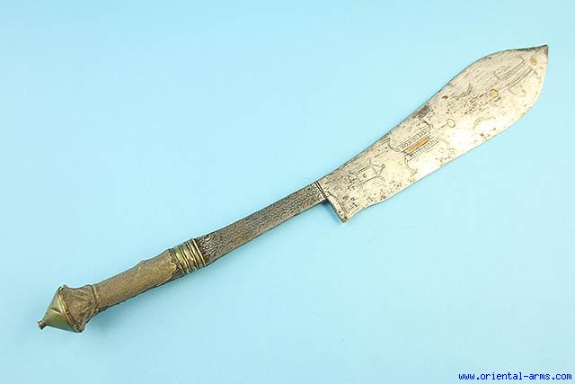 This unusual machete shaped blade is 16 inches long 3 inches wide. Simply engraved and with brass and copper inserts. Wood grip covered with ray skin and mounted with brass pommel and collar. Total length 22 inches. Very good condition. The engraving style and the copper / brass inserts suggests an African origin. However the sting ray skin cover is a bit more Asian. |