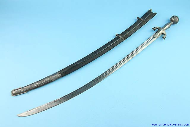 The Pulwar’ is the Afghan relative of the Indian Tulwar. The Pulwar hilt has a very distinct shape, with down curving quillons. The one offered here for sale is a very fine and unusual fighting sword, with a massive, well made blade 31 inches long with deep fullers. The steel handle is of typical quillon shape with a ball shaped beautifully ribbed pommel (scarce version) . Original black leather covered scabbard with steel mounts. Total length 36 inches. Very good plus condition. The steel seam cover is later. A very impressive well balanced sword |