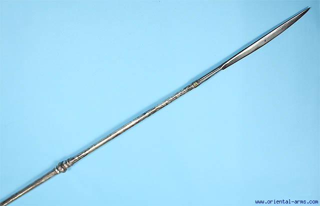 This very long spear (104 inches, 264 cm) is Burmese, 19 C. of fine quality and condition. The single edge blade is 13 inches long forged with a 4  inches socket. The long haft is covered with silver sleeves and with a leather cover in the center. Steel tip with a spatula shaped end. Very good condition. Scarce spear.