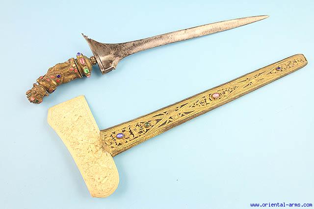 This Keris dagger is coming from Bali, Indonesia. Early blade late 19 C. The 15 inches blade is forged from very good highly polished pamor steel. Fine brass handle in the shape of a mythological creature set with colored stones. Later, mid 20C. wood scabbard covered with pierced silver set with colored stone and finely carved bone wrangka. Total length 25 inches. Very good condition. Very attractive item. |