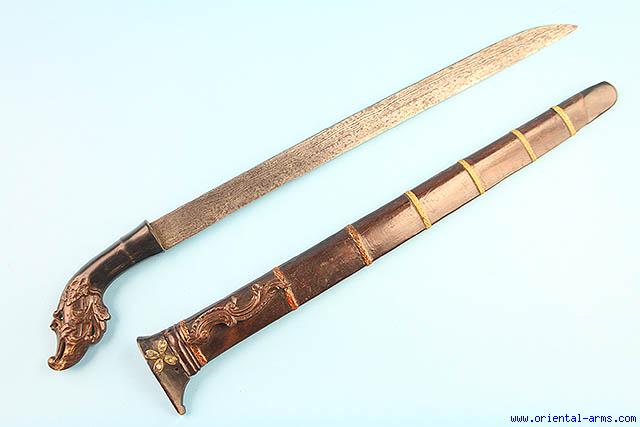 This Parang sword is late 19C. probably from Java. Its heavy blade is 20 inches long very well forged with a ridged spine and unusual pamor structure. Black horn handle with finely carved and gold painted pommel. Wood scabbard with horn mounts and braided rattan binding. Finely carved belt loop. Scabbard mouth set with clear stones. Total length 27 inches. Very good condition. |
