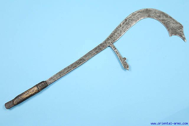 This rare form of throwing knife is used mostly by the Funj people residing in the valley of the Blue Nile in Sudan (But also used by the neighboring Kirdi people). Very early form 27 inches long decorated with simple geometric design and engraved styled animals. Original leather covered grip. Very good condition. Early - mid 20C. |