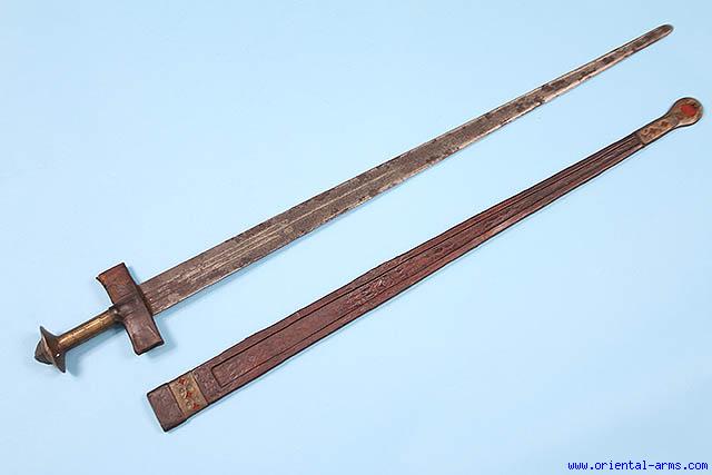 This very good Takouba the sword of the Tuareg people is a 19 C. sword, with a double edge 32 inches blade marked with a styled faced moon marks on both sides of the blade. The hilt is of the classical Takouba design made of steel with a faceted brass covered grip and leather covered cross guard. The scabbard is finely tooled leather with brass mounts. Total length 38 inches. Very good condition. Few blackened spots on the blade. Minor losses to the leather cover of the scabbard. |