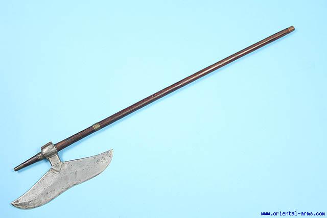 The BULLOVA is the traditional fighting axe of the Chota Nagpur aboriginal tribes of central India. We offer here for sale a very good heavy exemplar, early - mid 19 C. with a Moustache shaped blades, 11 inches long. Hardwood haft, 33 ½ inches long. Very good condition. |