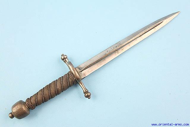 This is a 19C. copy of a 16C left hand dagger. Fine fullered blade 8 1.2 inches. Grip bound with tight binding of twisted steel wire. Steel pommel and cross guard. Total length 13 inches. Very good plus condition, No scabbard.