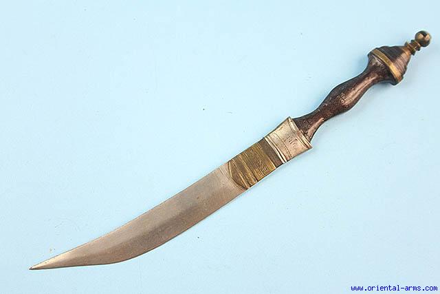 This very good dagger is coming from west Africa. Mid 20 C. and of good quality. Curved blade 7 ½ inches long of flat diamond cross section with 1 1/2 inch ricasso with engrave silver . brass cover marked IN . Black horn grip with silver wire inserts. Total length 12 ½ inches. Very good condition. No scabbard. |