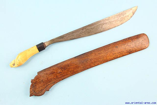 This small but very good knife is most probably a RAWIT a possible utility knife used by the Batak people of Sumatra. Short, heavy finely laminated blade. Ivory and horn handle. Wood scabbard. Blade 9 1/2 total 14 inches. Very good condition. Good age patina on the handle |