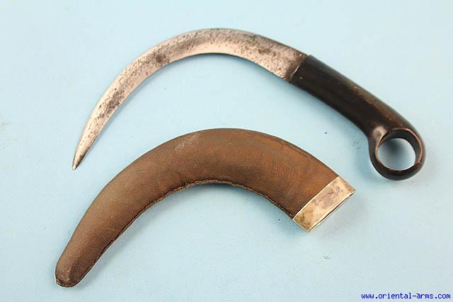 This Korambi curved dagger comes from Sumatra, late 19 C. Well forged blade, deeply curved claw shaped double edged 51/2 inches long. Black horn grip with thumb hole. Wood scabbard with leather cover and silver chape. Total length 7 1/2 inches. Very good condition. The leather cover and chape are later. |