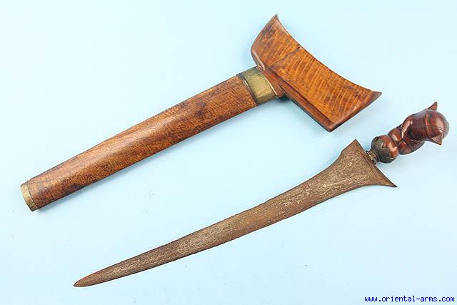 This very good Bugis Keris Dagger has a 14 blade with clear pamor structure. The mendak is engraved brass with. Classical Bugis hilt and the scabbard carved from grained wood. Total Length 18 inches. Very good condition.