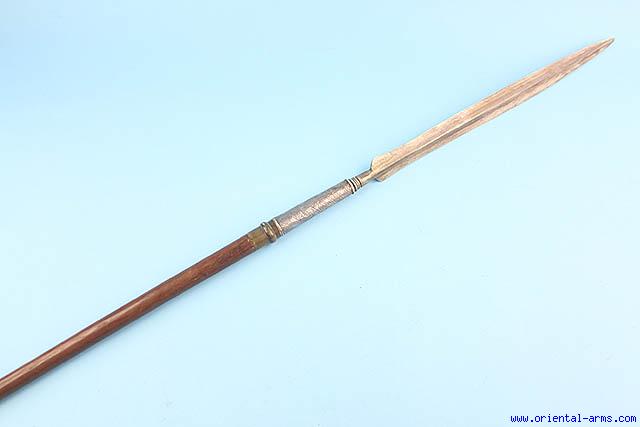 Up for sale is this very good spear, Indonesia, late 19 - early 20 C. Massive pamor blade with pronounced central rib 19 inches long. 5 inches chased silver collar. Wood haft. Total length 66 inches. Very good condition