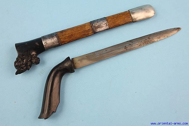 The Badek (or Badik) is a knife / short sword from Java, Indonesia. It is characterized by its single edge blade with straight back, up-curving edge, and the pistol grip shape handle. This one has a very unusual spear shaped double edge blade 7 inches long. Horn handle and carved scabbard mouth. Iron and silver bands on the scabbard. Total length (in scabbard) 12 inches. Very good plus condition.
