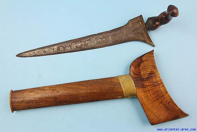 This Bugis Keris Dagger has a heavy slightly curved blade of very good pamor structure. The mendak is engraved brass. The hilt and the scabbard are finely carved from a beautifully grained wood, in a classical Sulawezi style. Scabbard dimensions are bigger and wider than usual. Blade length 13 inches. Total Length 17 inches. Very good condition. |