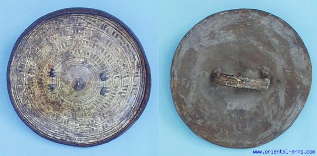 We offer here for sale an early 20 Century war shield from Somalia. It is 12 inches in diameter and made of Buffalo (?) hide very nicely tooled with geometrical design. Very good condition. Beautiful age patina.
