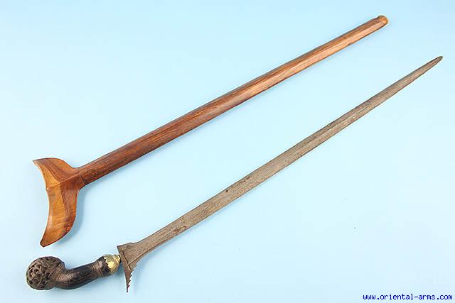 A Keris Penjang , also sometimes referred to as Execution Keris from Sumatra, late 19 C. The blade is 25 inches long, forged from pamor steel and finely fullered. The hilt is horn with finely carved bulbous pommel. Fine grained wood scabbard. Total length 29 1/2 inches. Very good condition. Minor wood chips on the scabbard. A fine item. |