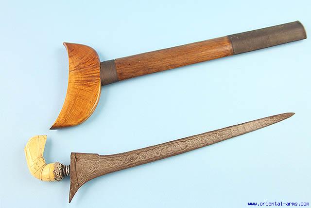 This fine keris is most probably Bugis, late 29C. Fine straight blade forged from pamor steel with clear and clean structure. The handle is carved from ivory (We think it is Walrus ivory) and the mendak is made of beautiful brass filigree work (with traces of silver plating). Wood scabbard bound with thread, Blade 15 inches long. Total 19 1/2 inches. Very good condition. |