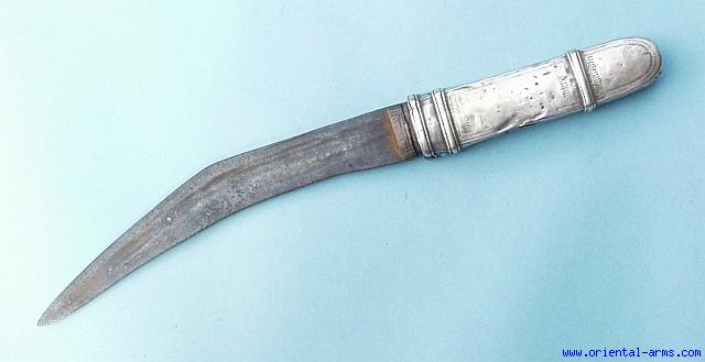 This small knife is called in Arabic as Shafra or Kusha. It is carried in a special compartment attached to the rear side of the wide belt behind the Jambiya (Khanjar) dagger. It is found all over The Arabian peninsula id varying shapes. Here the blade is 7 inches long, heavy, down curving with a shallow fuller. The grip is engraved silver. It should be noted here that several sources (Stone, Egerton and others) identify this type of knife as Nepali. Good condition. Old age patina on the blade, minor pitted spots and few dents on the silver grip.