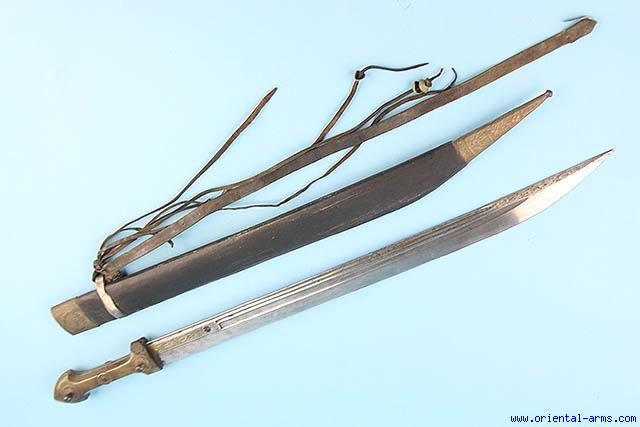 This sword is of Persian origin and it is also known as Quadara. A similar sword is found in central Asian countries and in the Caucasus. This specimen has a 24 inches long, massive single edge blades with a 7 inches false edge. The blade is fullered and marked with a deep maker mark and decorated with gold koftgari work. The grips are black Buffalo horn mounted with three rivets over old Persian silver coins. Original scabbard, covered with dark leather with chased brass mounts. Original leather belt. Very good condition. Minor losses to the gold work on the blade. Old repair on the grips. |