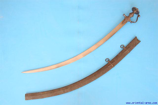 Up for sale is this fine Shamshir sword, with a very fine Persian made blade and Indian style handle. The blade is of a classical Shamshir sword, 32 inches long, single edge, wedge cross section, forged from very fine wootz steel with clear high contrast watered pattern. Military style whole metal brass scabbard. Total length 38 inches. Very good condition. Well polished and etched blade. Good age patina on the scabbard. A fine shamshir sword. |