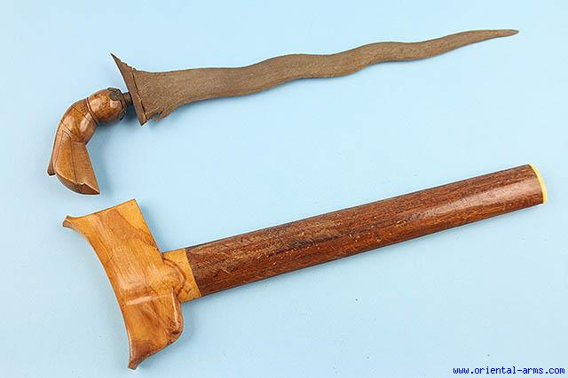 This very good Bugis Keris Dagger has an old wavy blade 15 inches long, with clear nice pamor structure. The mendak is brass. The hilt and the scabbard are carved from a beautifully grained wood. Total Length 18 inches. Very good condition. Minor damage to the mendak. |