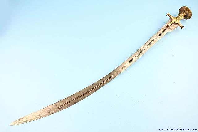 This sword is Indian, mid - late 18C. heavy thick and sharp blade 33 1/2 inches long with Armory (?) mark. Steel handle with gold koftgari decorations. Total 38 inches. Very good condition. Losses to the gold koftgari on the handle. Minor pitted patches on the handle. No scabbard. |