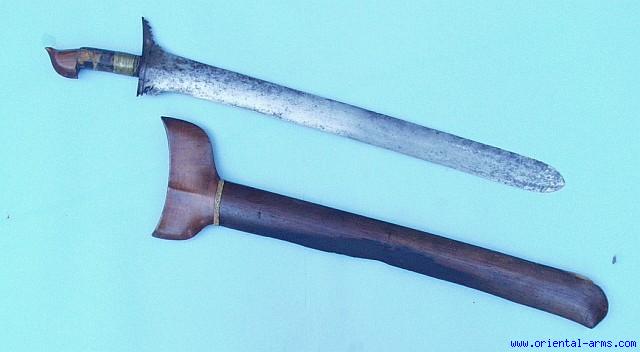 We offer for sale this early Kris Dagger, probably Moro but we are not sure. Size and shape indicate an early style, late 18 or early 19 C. The straight heavy blade is 22 inches long, probably laminated. The Ganja is smaller than in later Krises from the area and remind the Ganja of Indonesian Kerises. The grip is wood bound with leather and partially covered with brass wire. The scabbard is dark wood, also on the general shape of an Indonesian Keris. Fair condition. Some blackening and pitted areas on one side of the blade. Minor damages from battle scars on edges. The grip covering is later. The metal clamp is missing. The scabbard was partially burnt and have gone through later repairs, so the blade does not go all the way into the scabbard. Very low price. |