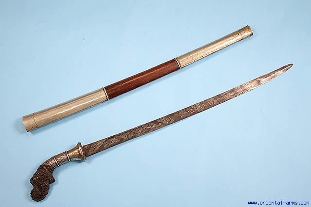 This fine parang sword is coming from Java, late 19 C. Finely forged pamor blade with polished black and white pattern 24 inches long. Beautifully carved horn handle with chase silver collar. original scabbard with white metal mounts. Total length 32 inches. very good condition. Minor edge nicks. Very small damage to the silver collar. Impressive parang. |