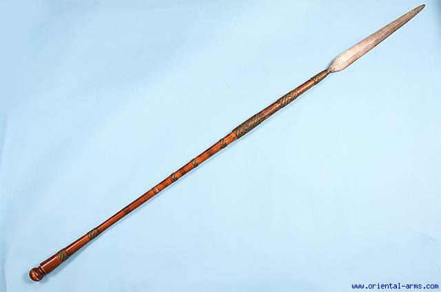 This heavy stabbing spear is Zulu, late 19 - early 20C. Solid steel blade of flat diamond cross section 16 inches long. Heavy hardwood haft with turned tip, bound with several bands of braided brass and steel wires. Total length 53 inches. Very good condition.