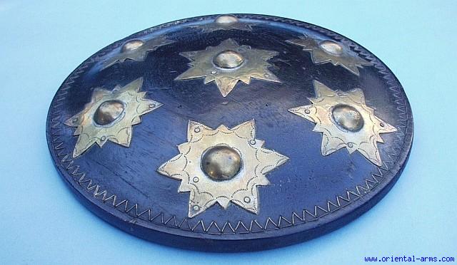 The Ache people of Central Sumatra are carrying this round hand hand shield (or Buckler) made of wood which is also locally known as .Peurise Kajee. It is 13 ½ inches in diameter, made of light wood and decorated with 7 brass stars. This is an authentic, very early 20 C. piece in very good condition. The rear handle is missing and replaced with modern rope. |