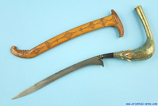 A very fine RENTONG knife / dagger from the Malay Archipelago. The version offered here is mostly used by the Acehnese people from North West Sumatra. The blade is 8 1/2 inches long down curving and single edged, most probably forged from laminated steel. Octagonal steel bolster. The hilt is wood with sharply up-curving pommel entirely mounted with gold, deeply engraved with blackened pattern. The scabbard is finely engraved wood. Total length 15 inches. Very good condition. Very rare and impressive item from the second half of the 19th C . |
