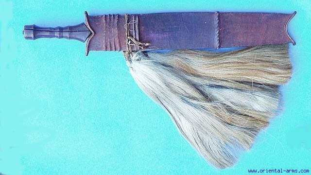A good old and complete sword of the Salampasu people residing in the southern Zaire. A very nice photo of a Salampaso warrior carrying a similar sword can be seen on the front cover of: Beaute Fatale the catalog of an exhibition of African weapons in Brussels, Belgium, 1992. The blade is 16 inches, very good and massive. The grip is carved wood, cracked on one side but hold very firm, and the scabbard is wood covered with raw hide set with rattan fiber at its mouth and decorated with a big and impressive bundles of white colored hair. Total length 23 ½ This is a late 19 Century authentic sword in very good condition. A scarce sword highly sought after by collectors of African weaponry and tribal arts. |